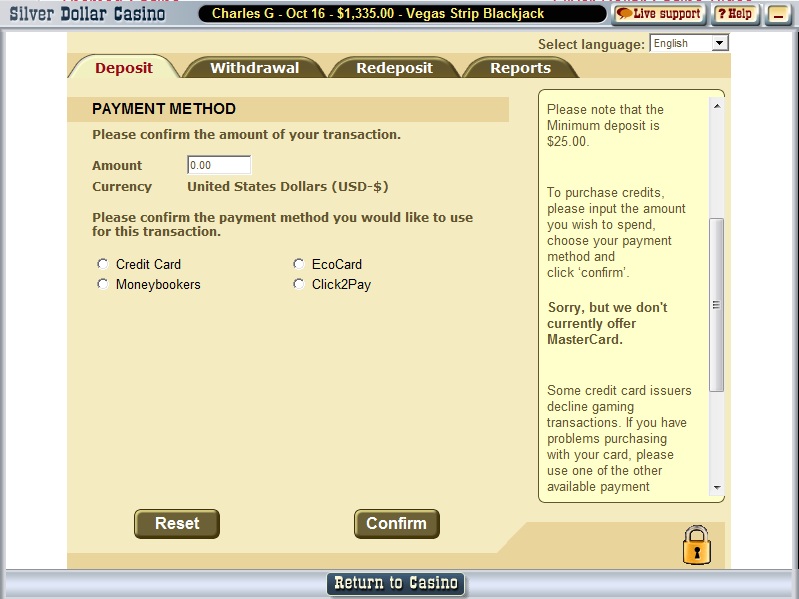 To deposit money at Silver Dollar Casino you can use NETeller, credit cards (Visa and MasterCard), EcoCard, QuickCash, MoneyBookers, Click2Pay, UseMyWallet, //online.worldcasinodirectory.com/mycitadel">myCitadelWallet, and direct cash.
