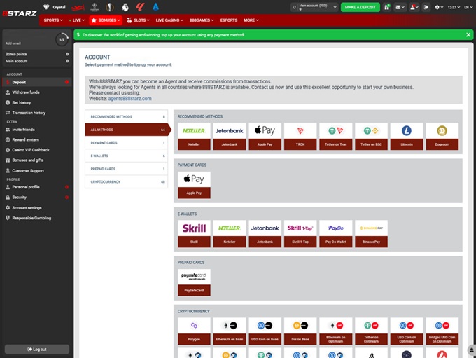 As you can see, 888Starz provides players with a variety of deposit methods, including crypto options, e-wallets, bank transfers, and prepaid cards. Accessing the deposit section is straightforward: simply click on the designated option, and a user-friendly interface will appear.