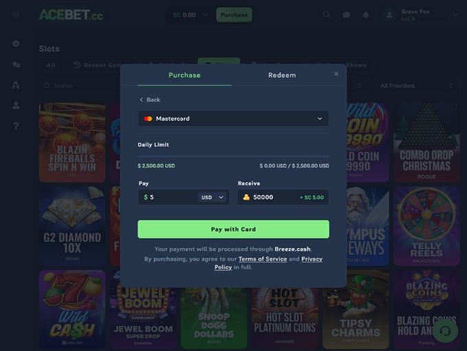 Like other US sweepstakes casinos, Acebet is free to join and play. No purchase is required to get started with Gold Coins. That said, players do have the option to buy GC and redeem Sweeps Coins for prizes, so those areas deserve a closer look by our WCD review team.