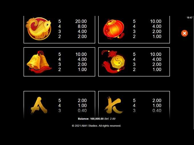 - Highest paying symbol is a golden Koi fish while Lantern, Bells and a Yin - Yang medallion pictures are on a slightly lower payscale
