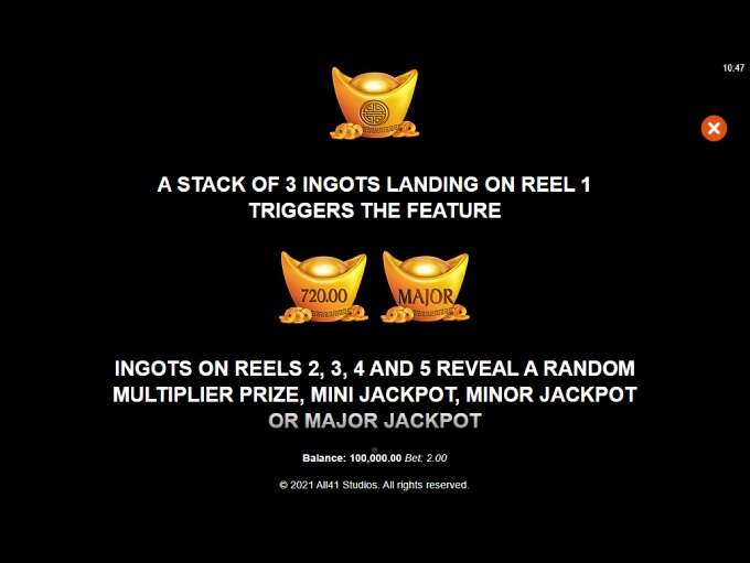 Collect feature – landing 3 golden ingots on the 1st reel triggers this round. Ingots landing on the 2 – 5 reels will come with prizes such as cash, Mini, Minor or Major Jackpots valued at:
