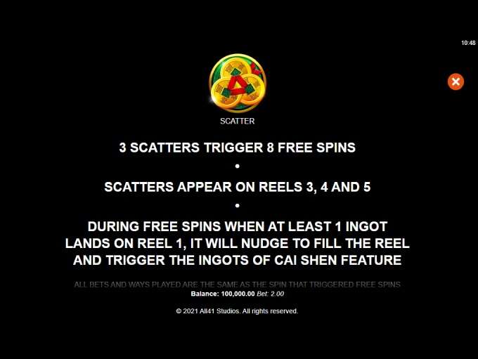 - Scatter is represented as a coin while a golden ingot can be seen during the Cai Shen Feature.