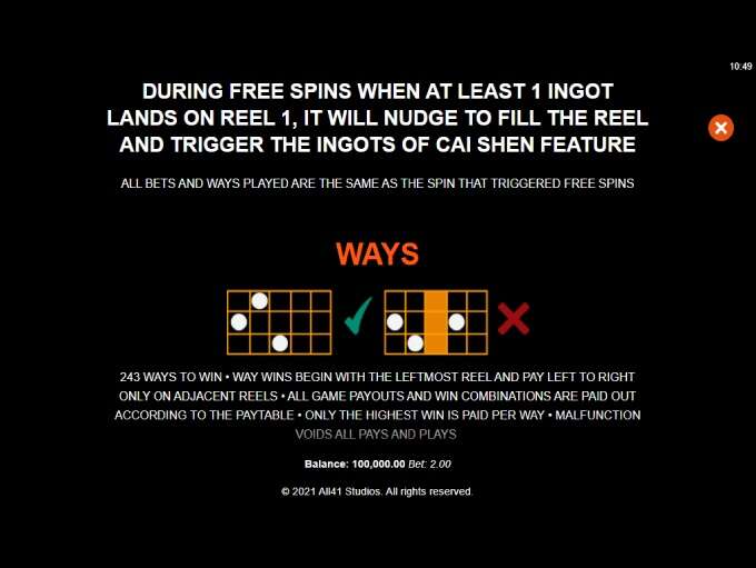 Ingots of Cai Shen is a 5 reels 3 rows online video slot that offers 243 ways of winning with betting ranges spanning from 0.1 to 100 coins per spin.