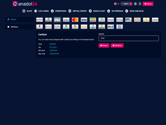 Depositing funds at Anadol24 Casino is straightforward and transparent. Players can choose from trusted methods like Visa, Mastercard, Skrill, Neteller, and Jeton, as well as crypto-based solutions for faster and more flexible transactions. The casino also caters to regional markets by offering localized payment options such as Interac, making it accessible to players in different parts of the world.