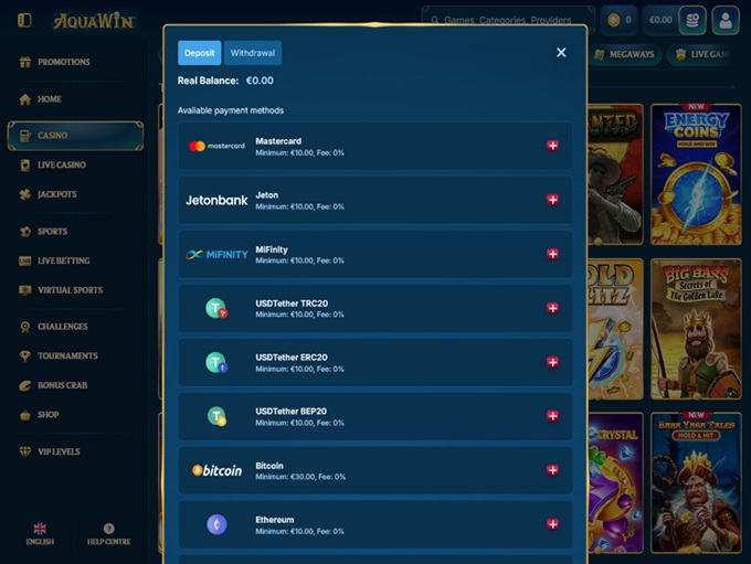 AquaWin is crypto-friendly and supports both fiat and crypto methods. The payment list includes: Mastercard, Skrill, Neteller, Jeton, MiFinity, and crypto options like Tether, Bitcoin, Ethereum, Litecoin, Ripple, USDCoin, Bitcoin Cash, and Dogecoin. Cardano in also mentioned in the crypto list.