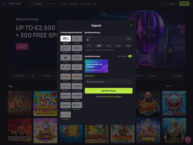 Bet and Play offers different payment methods which differ per region. Those include the following: Bitcoin, Litecoin, Dogecoin, Ethereum, Tether, Ripple, Binance, Visa, MasterCard, and Bank Wire Transfer. The following currencies are available such as EUR, USD, CAD, AUD, NOK, NZD, JPY, BTC, BCH, ETH, LTC, DOG, USDT…