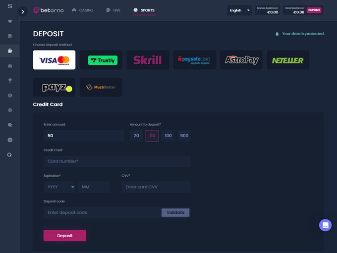 The following deposit methods are available to deposit money on the platform: Credit and Debit Card, PayPal, PayviaPhone, Neteller, Paysafecard, Skrill, Ecopayz,Trustly, Zonda, and BitBayPay. The availability of each payment method depends on the registration country and chosen currency. Players’ accounts will be credited with the deposit only after the deposit is confirmed by the operator and the relevant payment method. Until the confirmation is received, the deposit will not be included in the account’s balance. The operator does not provide credit, nor does it participate in, arrange, permit, or knowingly facilitate the giving of credit. Deposits made via PayviaPhone have a large processing fee which will be deducted from your deposit amount, so be careful about that.