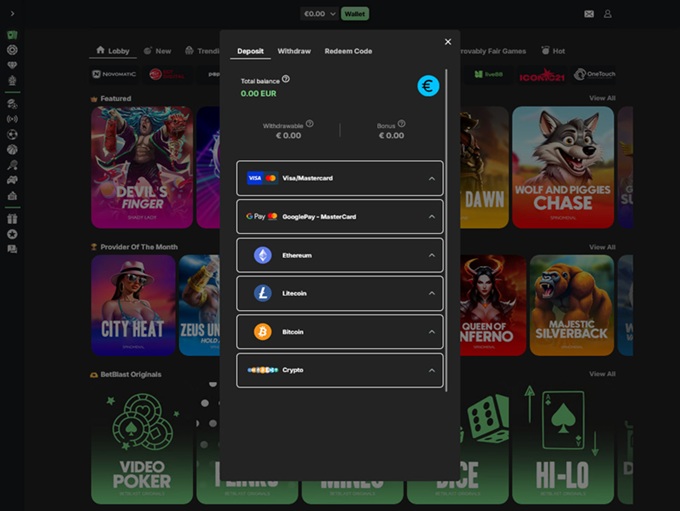 The layout. It’s pretty basic, but we don’t mind! The background is black, making the game tiles pop out. There’s a left-side menu that contains all the essentials – casino, live casino, Betblast originals, sportsbook, promotions, and FAQ. At the bottom of the homepage, you can find Terms and Conditions, bonus T&C, support section, and more.