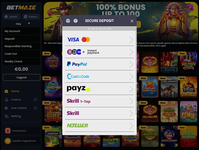 Betmaze supports a solid mix of secure payment methods, giving players straightforward ways to add funds and withdraw their winnings. Bank cards, eWallets, and prepaid options are all available, including popular brands such as Visa, MasterCard, Maestro, Apple Pay, a selection of cash voucher services, Neteller, PayPal, PaySafeCard, EcoPayz, and Skrill.