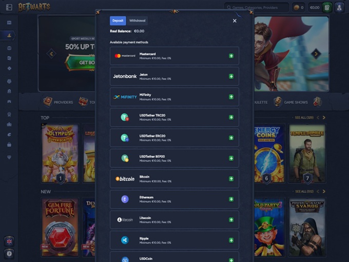 When it comes to banking, Betwarts can brag a bit, because the options are pretty flexible. You’ve got plenty of ways to fund your account, including Visa and Mastercard, e-wallets, prepaid vouchers, and a whole list of cryptocurrencies.