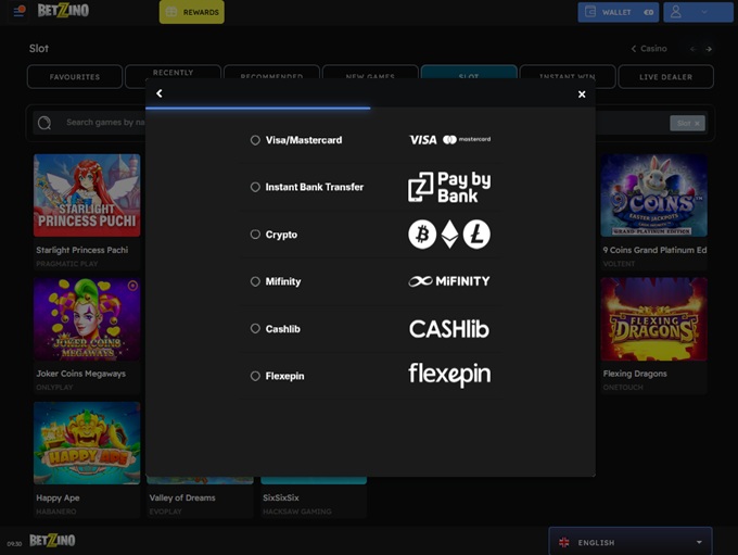 When you scroll down, you’ll see a selection of games from the library, including Most Popular, New Games, Trending Right Now, All Games, Betzino Favorites, and Megaways Slots. Lastly, towards the bottom, you’ll discover information about game providers, payment options, license suppliers, Terms & Conditions, rules, and more.