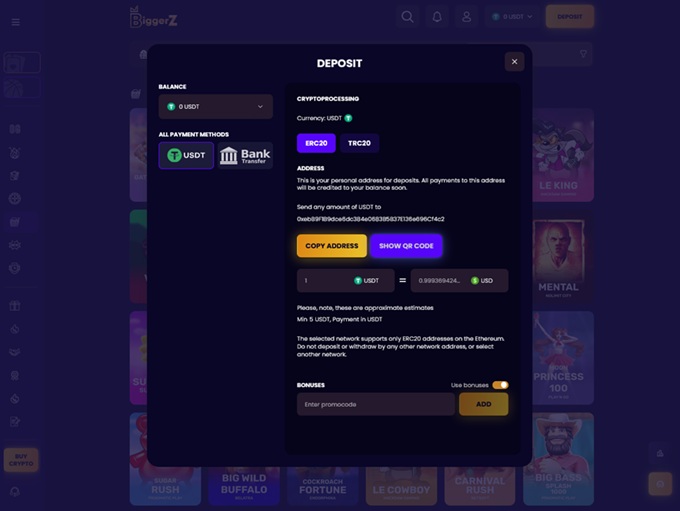 BiggerZ operates as a crypto casino only. There’s no credit card option sitting in the corner, no bank transfers in the background. Every deposit and withdrawal runs through digital currencies. You can fund your account with well-known coins like Bitcoin, Ethereum, Litecoin, Tether, Dogecoin, Ripple, Cardano, Binance Coin, Tron, USD Coin, Solana, and Bitcoin Cash.
