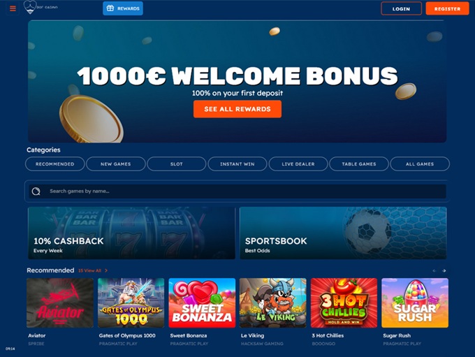 In terms of aesthetics, the casino presents a clean and modern design, built around a deep blue background with striking orange accents that highlight key details. Promotions on the homepage, subtle lines beneath game titles, and the bold registration button all stand out thanks to this color contrast, making navigation simple and intuitive.