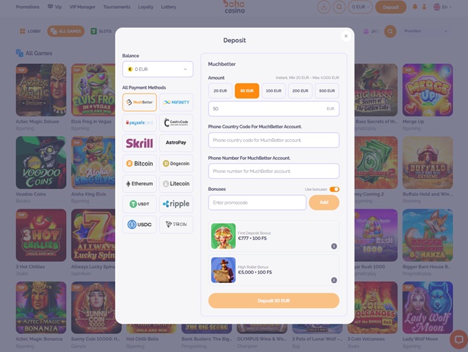 Having said that, BOHO Casino did an excellent job of ensuring that it will not only offer as many as possible, but it will also select some of the most popular banking methods from around the world. You can deposit via credit and debit cards, prepaid vouchers, e-wallets, bank transfers, cryptocurrency, and more.
