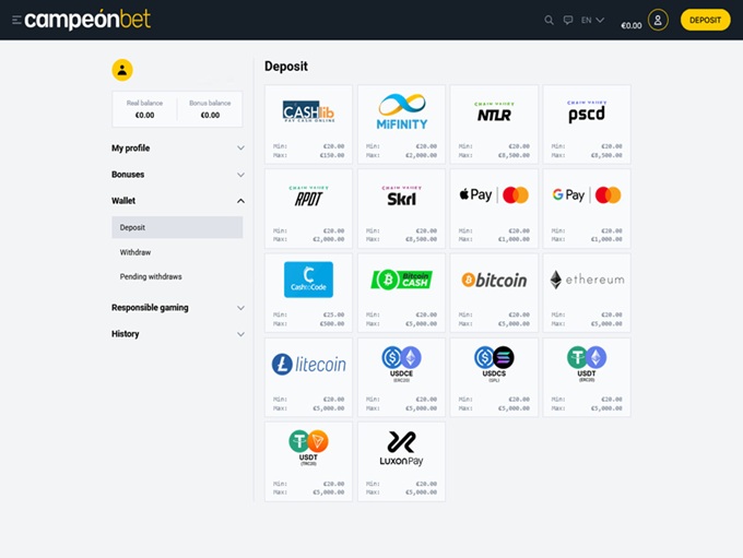 Most commonly used deposit and withdrawal methods are supported and no fees are currently charged to put money in or take it out. The minimum deposit is €10. Sofort and Multibanco are supported for deposits and withdrawals and most reports indicate that payments are made within a few hours.
