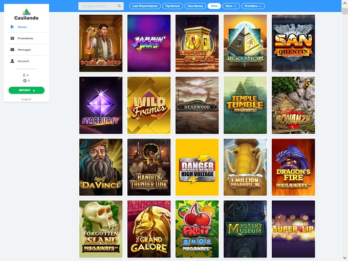 Players consistently find Casilando Casino accessible, user-friendly, effective, and enjoyable. The extensive game library is easy to navigate, allowing players to quickly find and choose their favorites. For additional options, simply scroll to the footer. The Games and Promotions links are conveniently displayed on the left side of the screen. However, there is room for improvement in the game’s selection interface.