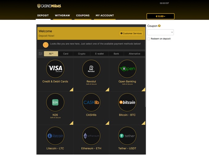 Casino Midas offers a variety of convenient and cost-free ways to deposit and withdraw. Major e-Wallets such as Skrill, ecoPays, and Neteller are supported as are various other vehicles like debit and credit cards. All transactions are safe and secure and your personal information is always protected.