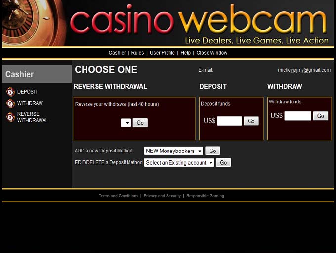 At CasinoWebCam, all transactions are conducted in US Dollars and non-US Dollar deposits are converted into their exact dollar value before they are deposited into the players' account. Their are multiple deposit options, including credit cards (only Visa, as the casino does not accept MasterCard or AmericanExpress, or even other credit cards like JCB and Discover), Neteller, and MoneyBookers. To withdraw money from your casino account, you can use, apart from Neteller and MoneyBookers, bank drafts and checks as well.