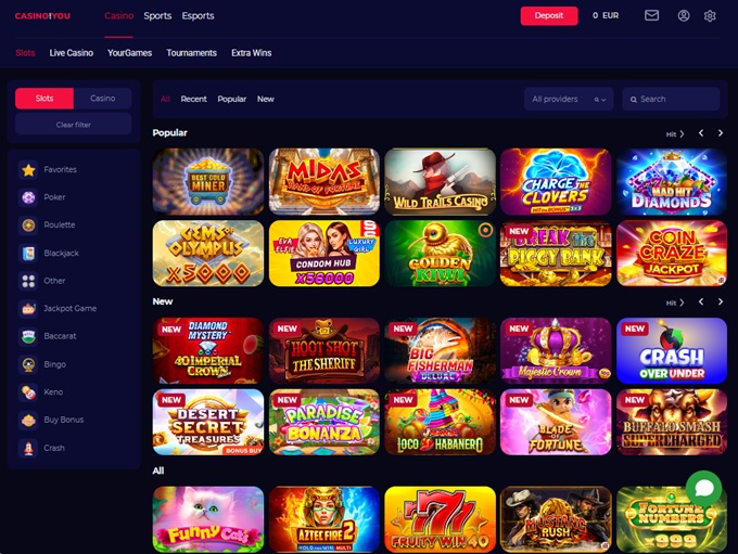 CasinoAndYou’s website combines depth with simplicity, offering a layout that’s rich in features yet easy to navigate. The main menu highlights four key sections — Casino, Sports, eSports, Tournaments, and Bonuses — giving players instant access to the platform’s most popular areas. Within the Casino section, visitors can choose between two main subpages: Online Slots and Live Casino, both acting as the central hubs for gameplay. A direct link to the Tournaments page is also conveniently placed for those who enjoy competitive play.