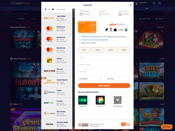 The payment section becomes visible after registration and supports quite a low choice of methods. Your country of residence will determine their availability, and the options include, Astropay, Visa, Bank transfer, Bitcoin, Bitcoin Cash, Dogecoin, ecopayZ, Ethereum, Jeton, Litecoin, MasterCard, Ripple, Tether.
