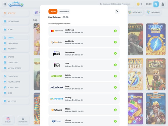 There are a vast number of different payment options. However, the availability is determined by the country the players are being based in. Once the account is all set, you’ll be able to choose from Visa, MasterCard, Klarna Instant Bank Transfer, Skrill, Skrill 1-Tap, Rapid Transfer, Bitcoin, Litecoin, Ethereum, Neteller, MiFinity, MuchBetter, eZeeWallet, Interac, Neosurf, Flexepin, CashtoCode, Paysafe Card, Nordea, Aktia, Danske Bank, POP Bank, OP-Pohjola Group, Handelsbanken, Suomen Verkkomaksut, Siru Mobile, Ripple, Pix, Santander, Bradesco, Boleto, Transferencia Bancaria Local, Bank Wire Transfer, AstroPay Card, Pay4Fun.