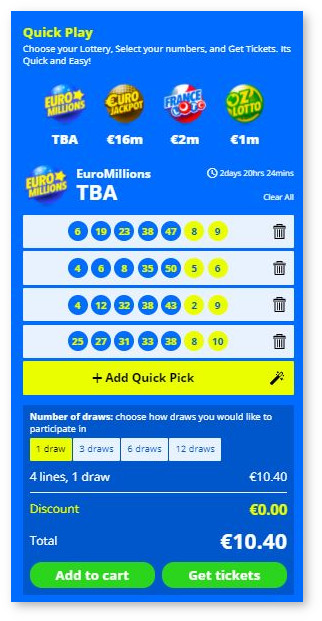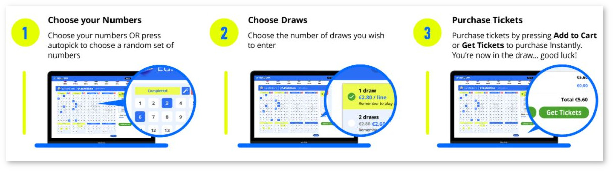 Choose a lottery to bet on, choose your numbers, decide how many draws you want to enter, and purchase your ticket(s).