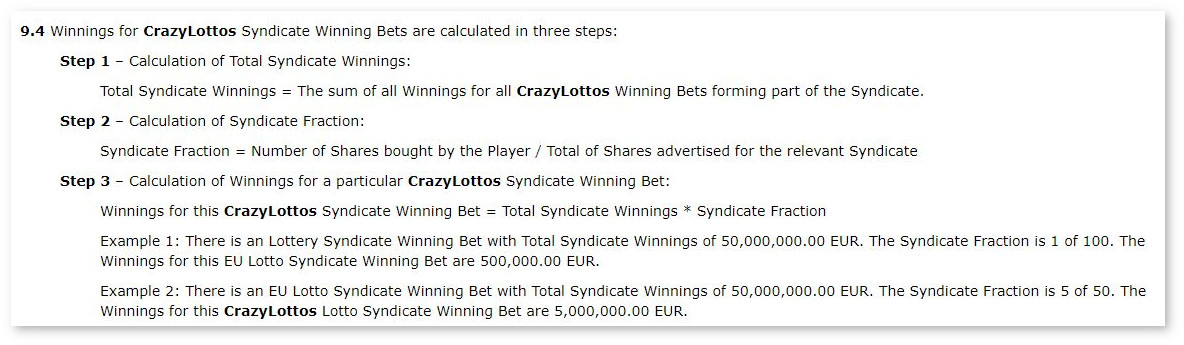 A syndicate buys 100 tickets for US Powerball. Your share is 20 tickets. One ticket wins and all others lose (for easy math). The winning ticket is worth 100 million EUR. You would receive 20 shares of the winnings or 20,000,000.00