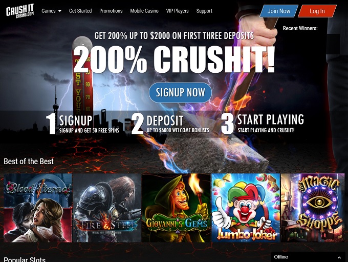 Crushit Casino launched online in early 2018 on the Supera Games Lithium cloud platform. The site is designed for instant play on any device with all games optimized for mobile play. Similar sites with different themes operated by Toft Marketing Inc since 2017 include LuckyBetz and Mega Vegas. The business has a data processing license and servers located in Costa Rica. US players are welcome.
