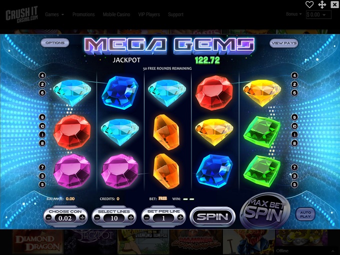 Some of the games were still delivered in Flash format as of May 2018 but all will eventually be converted to HTML5. Mega Gems Progressive Slot loaded in Flash in about 20 seconds on a 3.5Mbps stable connection and gameplay was uninterrupted by lag or any latency. For maximum effect, I opted for full screen and used 2.1 surround sound. The brilliant colors, expanding wilds, and respins took on much more of an exciting feeling than they could have on a mobile device. I had several small wins for a 92% RTP on a very small sample of 50 spins which was neither unexpected nor extraordinary.