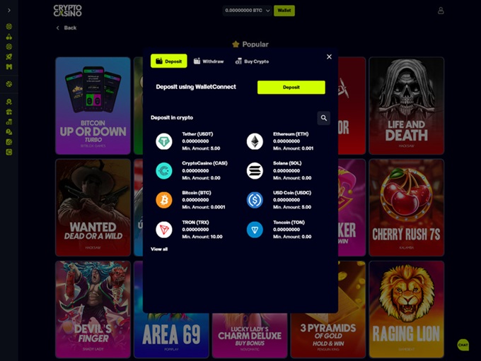 CryptoCasino is built around cryptocurrency transactions, offering a smooth and secure way to deposit and withdraw funds. Depositing is straightforward – players can send ETH directly via the Ethereum network or choose another supported cryptocurrency, receiving a unique deposit address based on the selected currency and blockchain.