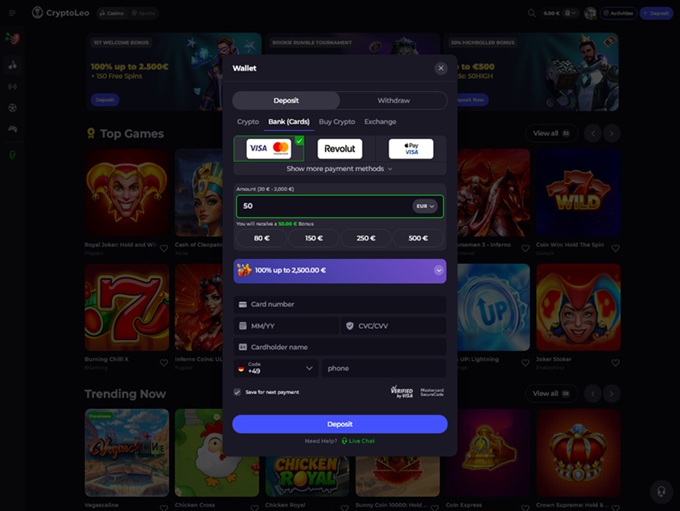 CryptoLeo excels in this category, having over 4,300 titles in its portfolio from the majority of the world’s most renowned gaming companies, like Evolution Gaming, Pragmatic Play, BetSoft, Play’n GO, Spinomenal, and NetEnt, to mention a few. Because of the huge game variety, most gamers should have no trouble choosing something to play.