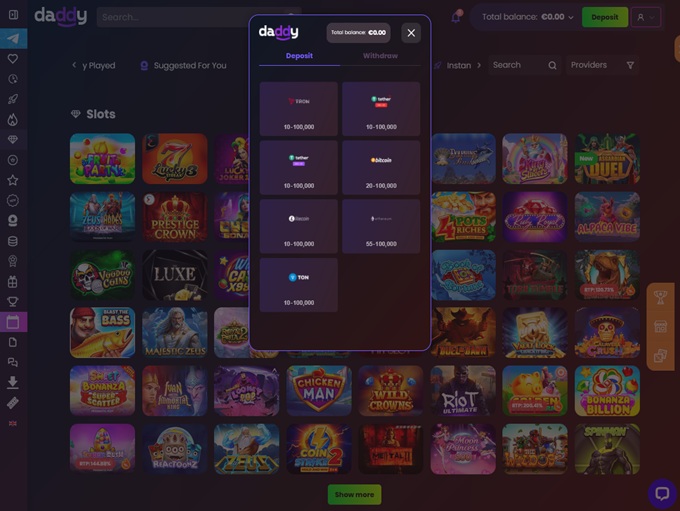 This casino unfolds a vast tapestry of entertainment, showcasing an extensive array of slots, live dealer games, and instant delights – more than 5,000 of them! For those entertained by the allure of spinning reels and captivating themes, this casino emerges as a haven. However, if the thrill of virtual sports or the rush of sports betting fuels your gaming desires, disappointment may loom on the horizon as Daddy Casino abstains from such offerings.