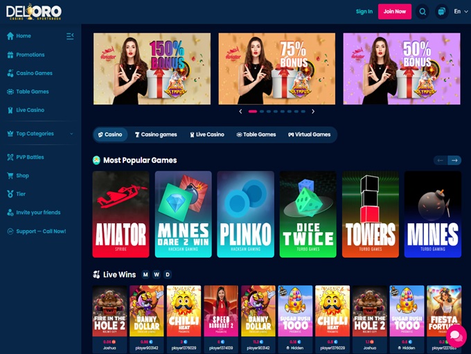 Meaning ‘gold’ in Spanish, Del Oro Casino offers a golden fusion of sports wagers and an extensive array of online casino games. Their enticing repertoire boasts a medley of roulette and blackjack variants, baccarat, video poker, keno, bingo, scratch cards, jackpots, a multitude of slots, and the crowd-pleasing crash games like Spaceman and Aviator.