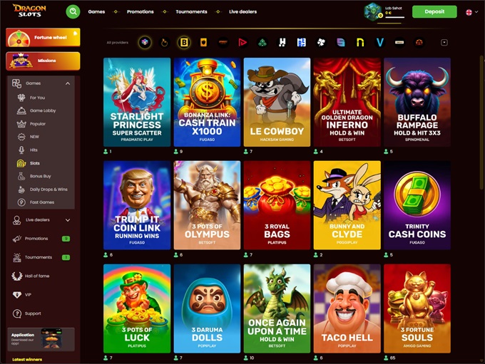 Online slots are, without question, the main attraction. That much is obvious from the name alone. The selection covers everything from big-name releases to themed titles that lean into the dragon vibe: Dragon Palace Adventure, Dragon’s Dungeon, Dragon’s Keeper, Dragon’s Blessing – you get the idea! Some are flashy, some are simple, some are just plain fun. And yes, there are plenty with bonus buy features for players who like to skip ahead.