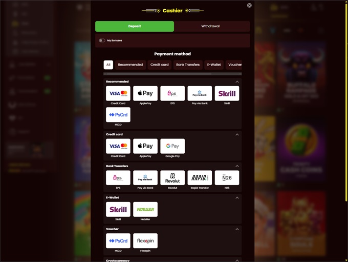 Starting here won’t take long at all! After you set up an account with a few standard details, the deposit button is visible at the top of the page. One click opens the wallet, and from there it’s just a matter of choosing a method and entering an amount. The interface lays everything out clearly, so you won’t get lost here.