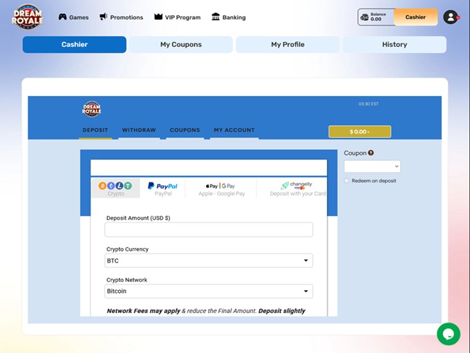 Banking at Dream Royale Casino is designed to be both flexible and secure, giving players confidence when moving funds in and out of their accounts. The casino accepts more than five reliable payment options, with a strong focus on supporting both traditional banking and cryptocurrency transactions.