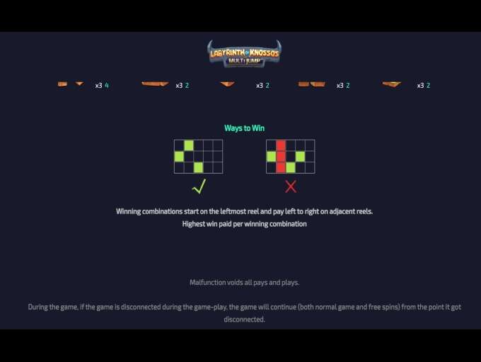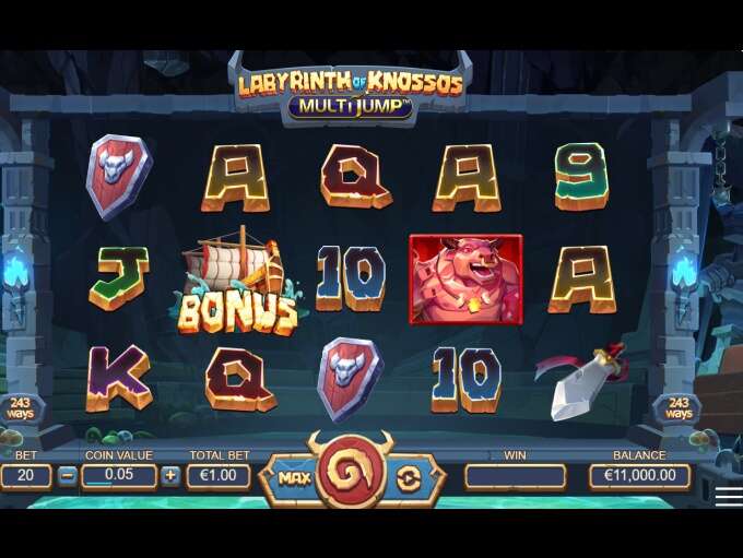Labyrinth of Knossos Multijump plays on a 5x3 grid configuration and provides you with 243 ways to win, and as far as betting ranges go, the minimum bet stands at 0,2 and goes up to 60 coins per spin.