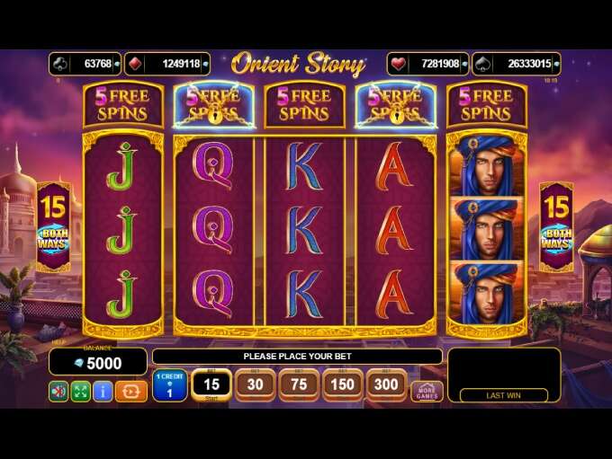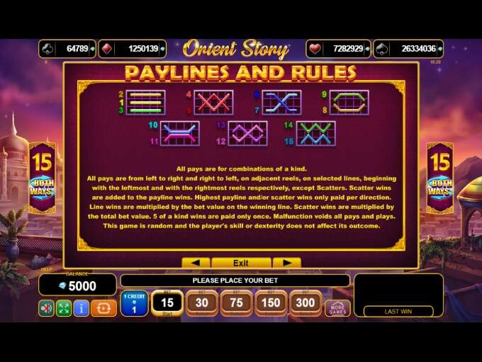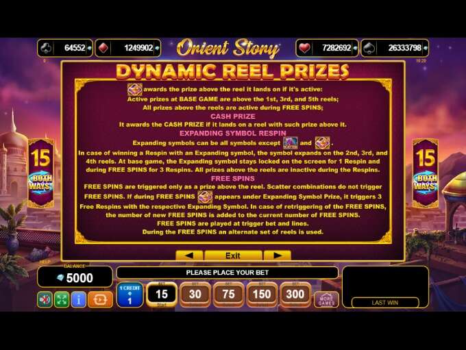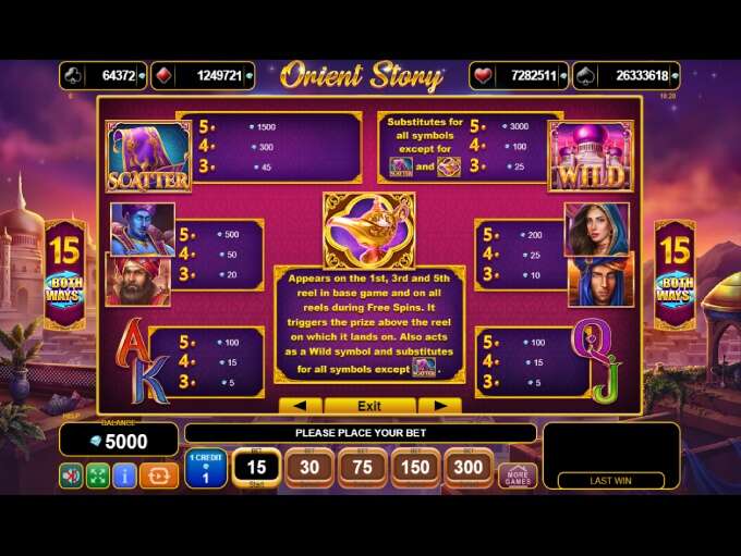 Orient Story is a 5 reels 3 rows high online video game with 15 paylines with betting ranges spanning from 0.5 as the minimum up to maximum of 1000 coins per spin.