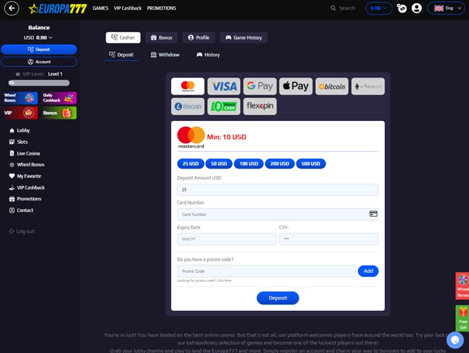For those looking for something extra, Europa777 also features a bonus wheel, allowing eligible players to spin for potential rewards, including extra spins and deposit boosts.