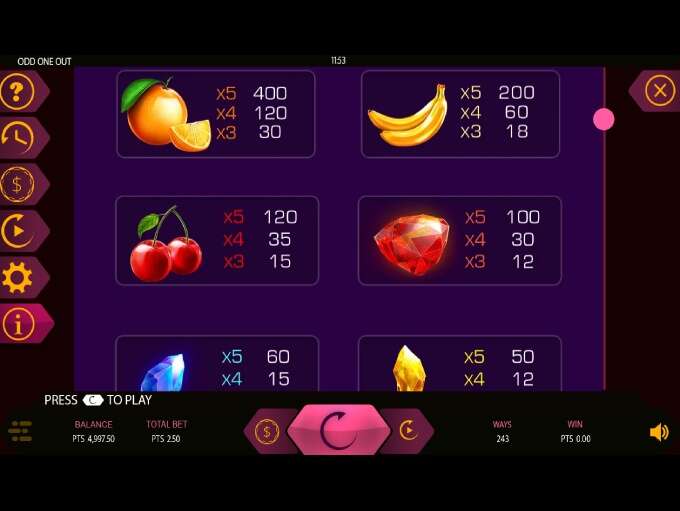 Odd One Out is an online slot released by Expanse Studios in February 2021 that plays on a 5x3 grid configuration with 243 paylines.