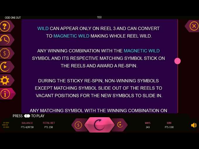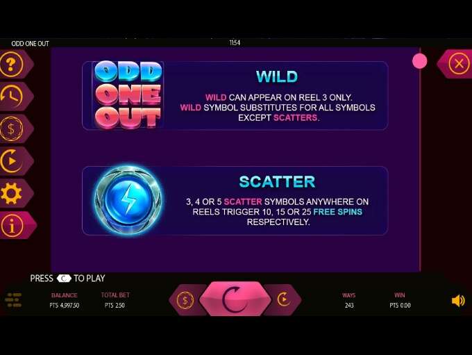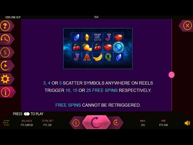 Odd One Out is a 5 reels 3 rows online video slot that offers 243 ways of winning, with betting ranges spanning from 0,25 to 25 coins per spin.