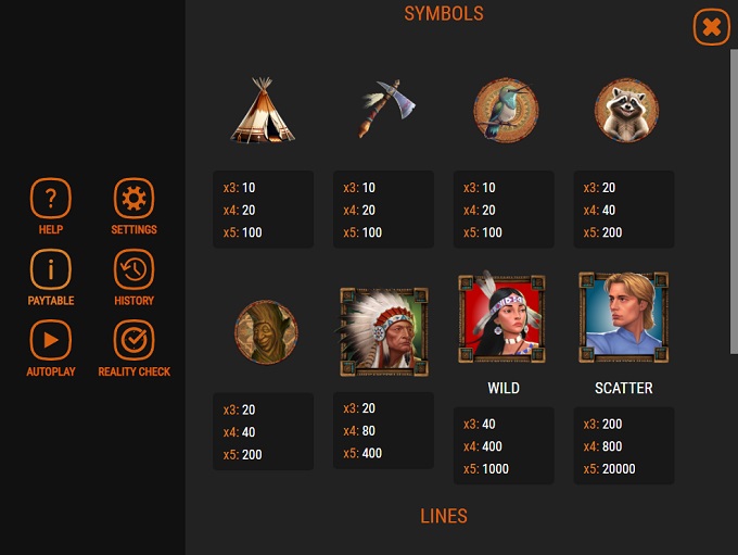 Beautiful Native American girl is the Wild symbol, while man character acts as the Scatter icon paying up to 40.000, 160.000, and 4.000.000 for three and more matching symbols anywhere on the screen.