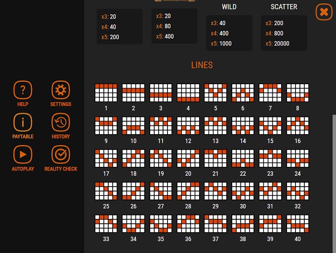 Pia video slot plays on five reels and four rows where 40 fixed paylines are crossed. All symbols, except Scatters, form winning combinations landing from left to right on adjacent reels along an active payline. If simultaneous wins happen on a single line, only the highest one will be apid, while wins from different lines will be added.