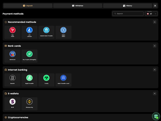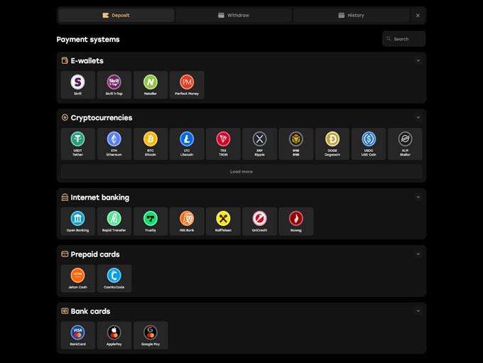 A variety of popular online banking options are accepted for quick and easy payments. It supports credit and debit cards, bank transfer and several e-wallets such as MiFinity wallet, Jeton, Neteller, Skrill, Rapid Transfer, Astropay, Zimpler which are all transparent on the website. The platform provides a crypto-friendly environment and is blockchain-powered setting with various advantages. Also, different currencies are available such as EUR, US dollars, Tether, Ethereum, Dogecoin Bitcoin, Litecoin, Dash, TRON, and others. Deposits can be made in almost every standard option as well as the unique crypto setting. For example, there are standard paths like Visa, MasterCard, Bank Wire Transfer, Perfect Money but also blockchain-based ones such as Tether, Ethereum, Bitcoin, Litecoin, Dash, TRON, and others.