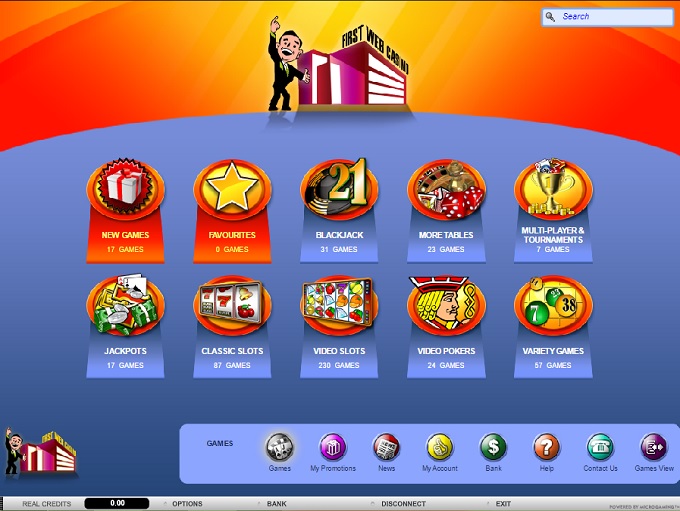 Microgaming provides the software to First Web Casino. The software has all the variety at Microgaming's disposal. There are seven languages and four currencies to start with. Players can choose between download games and instant play games. I recommend that players take the few minutes required to download the software because more games are available in the download format. The system requirements are moderate. The computer has to be the equivalent of Pentium 100 or higher; a 16 MB RAM is required and the monitor specs are 8-bit color SVGA (640x480) with 256 colors.