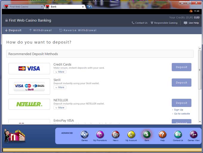 First Web Casino offers a number of deposit options. Most of them credit the deposit immediately. Bank Transfers take up to three days to complete. Withdrawals are also very fast, usually taking less than 5 days. A large number of options allow transfers in dollars, pounds or euros. More details on banking transactions are provided on the right side of this page.