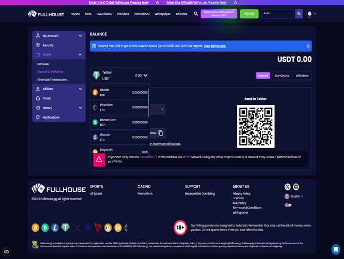 Fullhouse Casino ensures smooth and secure transactions with a well-rounded selection of deposit and withdrawal options. Whether players prefer traditional crypto giants or low-fee alternatives, the platform offers a range of choices tailored to different needs.