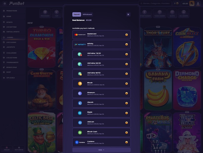 FunBet Casino offers a broad selection of payment methods, ensuring players from different regions can manage their funds with ease. Whether you prefer traditional banking, e-wallets, or cryptocurrency, there are multiple options available for both deposits and withdrawals.
