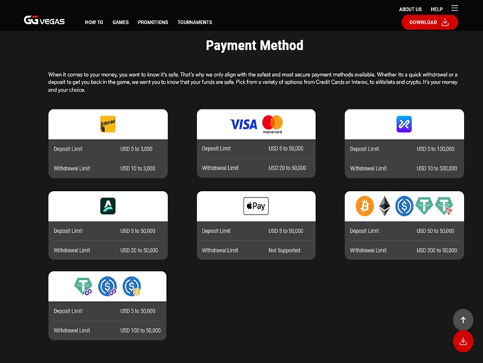Banking at GGVegas is built to give players flexibility and confidence. The platform supports a mix of payment options, from credit and debit cards to digital wallets and modern alternatives like Apple Pay and select cryptocurrencies. Interac and Astropay are also part of the lineup, making it easy for players to choose the method that suits them best.