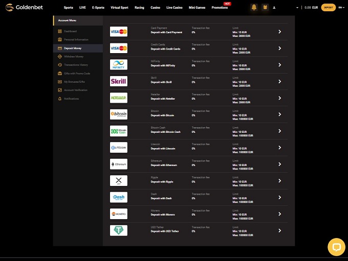 GoldenBet offers a solid range of payment options like Visa, MasterCard, Sofort, Skrill, Neteller, Bitcoin, Bitcoin Cash, Litecoin, Ethereum, Tether, Ripple, Dash, and Monero. Hence, there are bank transfers, credit cards, e-wallets, and cryptocurrency. Aside from crypto, the platform accepts other currencies like EUR, USD, CAD, and BRL.